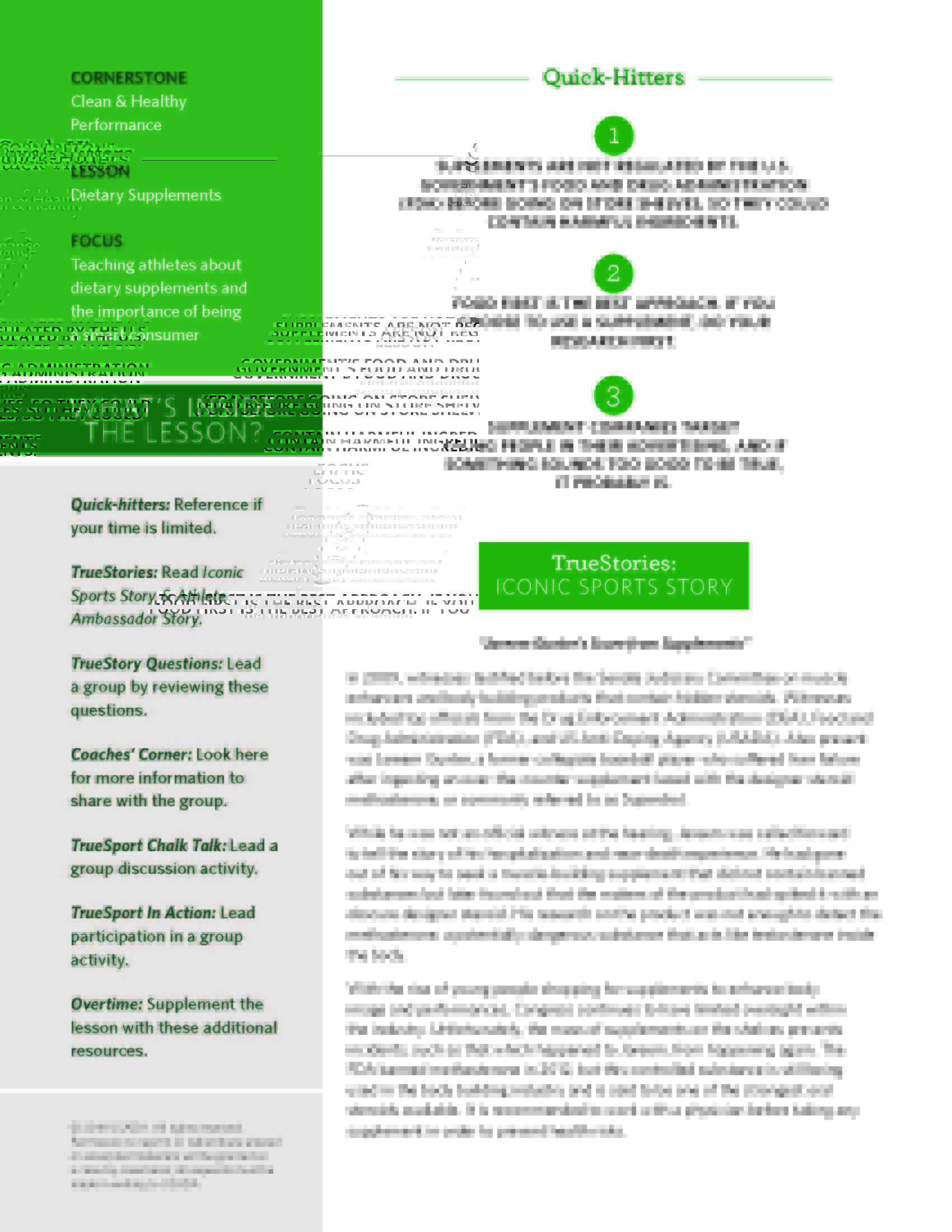 In addition to the Dietary Supplement Lesson Booklet, you will also receive one-page resources tailored for athletes, parents, and coaches that support the information being presented throughout the TrueSport Lesson. These take-home resources help bring the conversation from the field of play to the dinner table!
