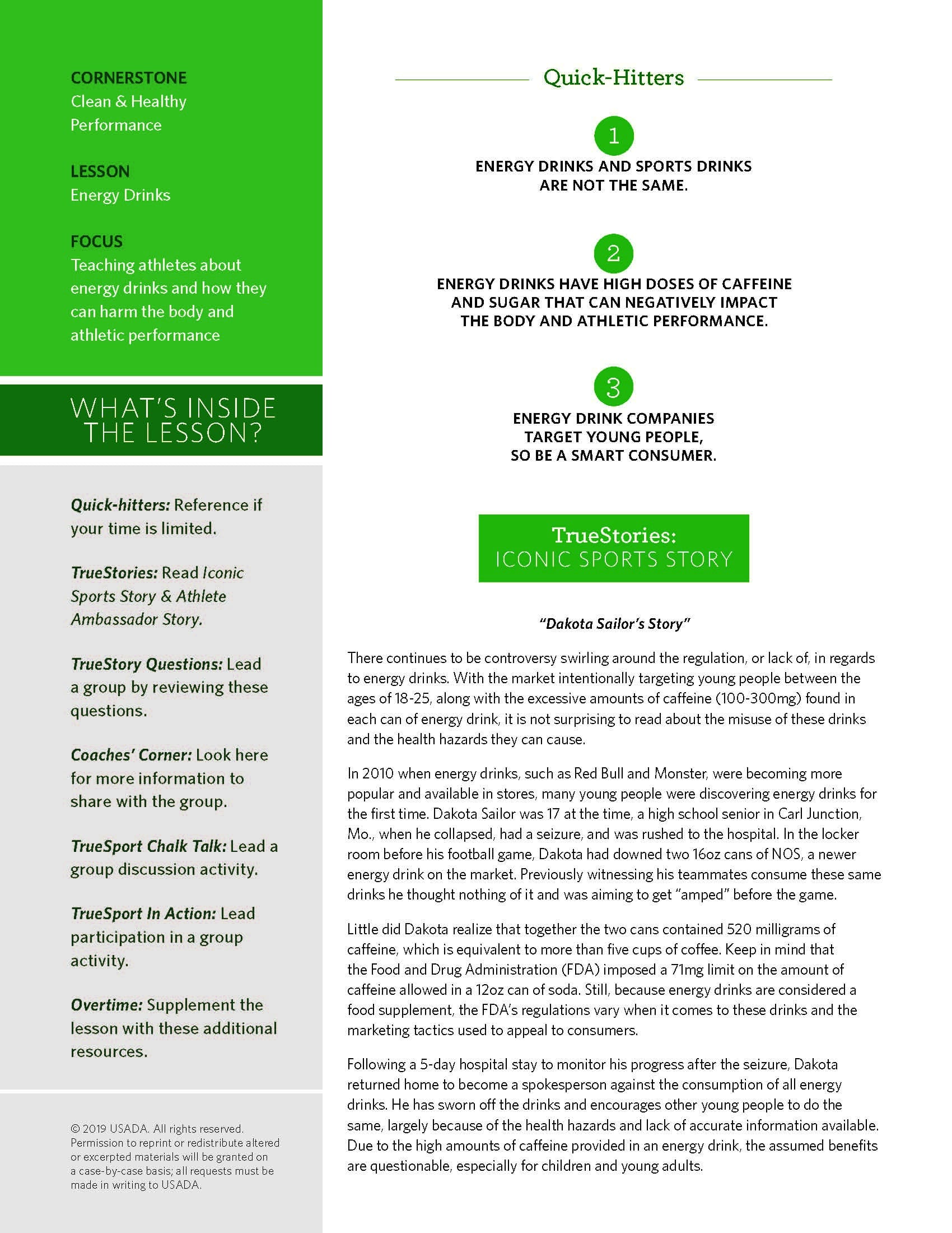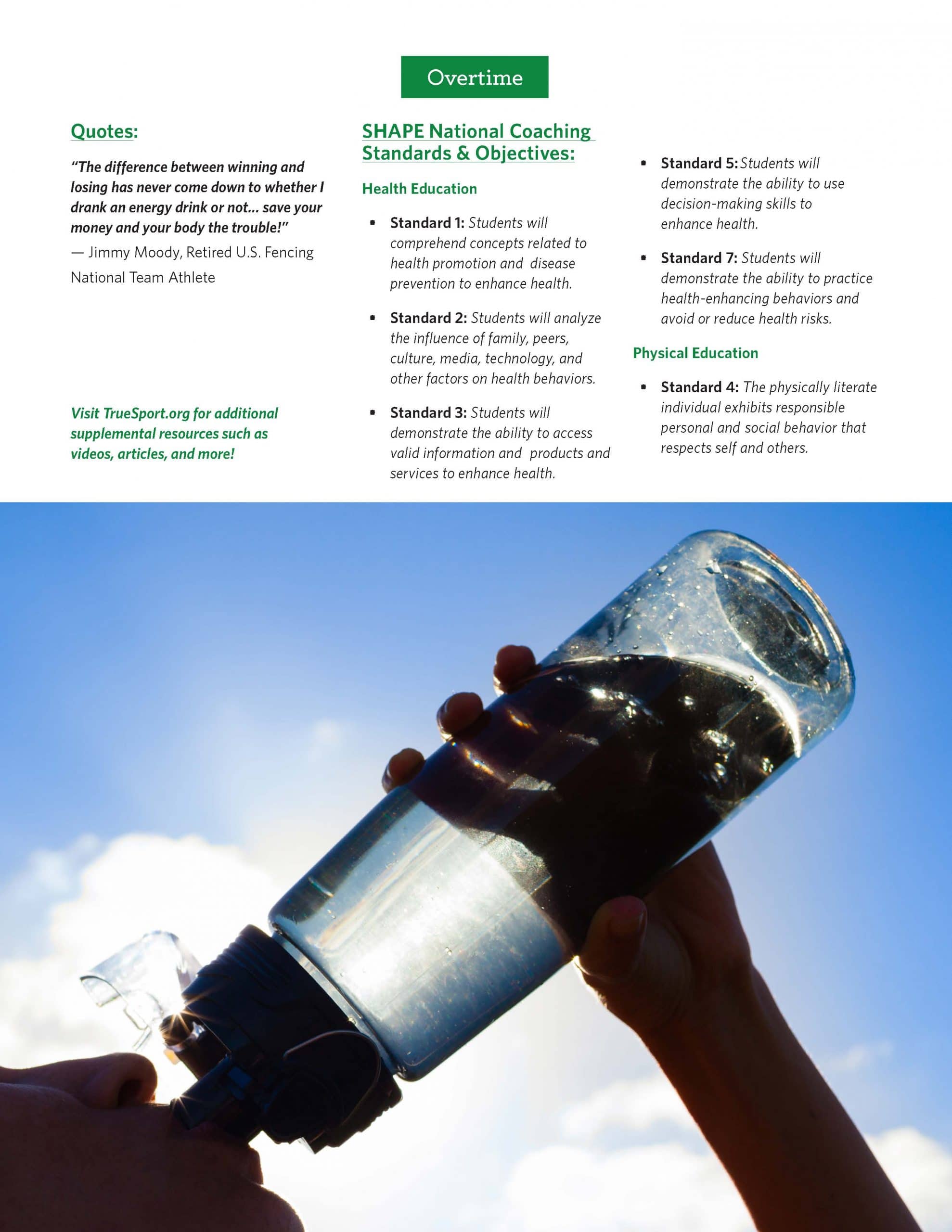 In addition to the Energy Drinks Lesson Booklet, you will also receive one-page resources tailored for athletes, parents, and coaches that support the information being presented throughout the TrueSport Lesson. These take-home resources help bring the conversation from the field of play to the dinner table!