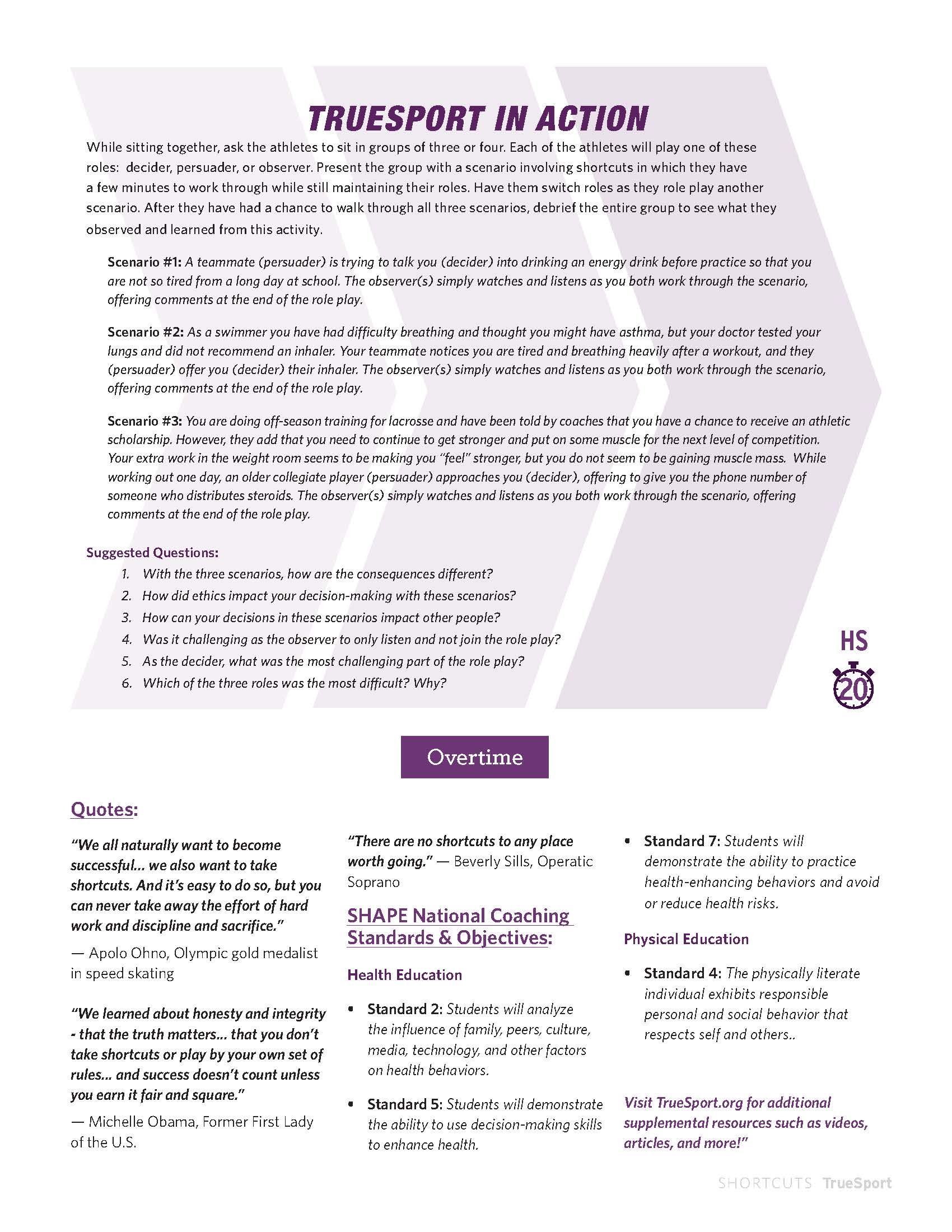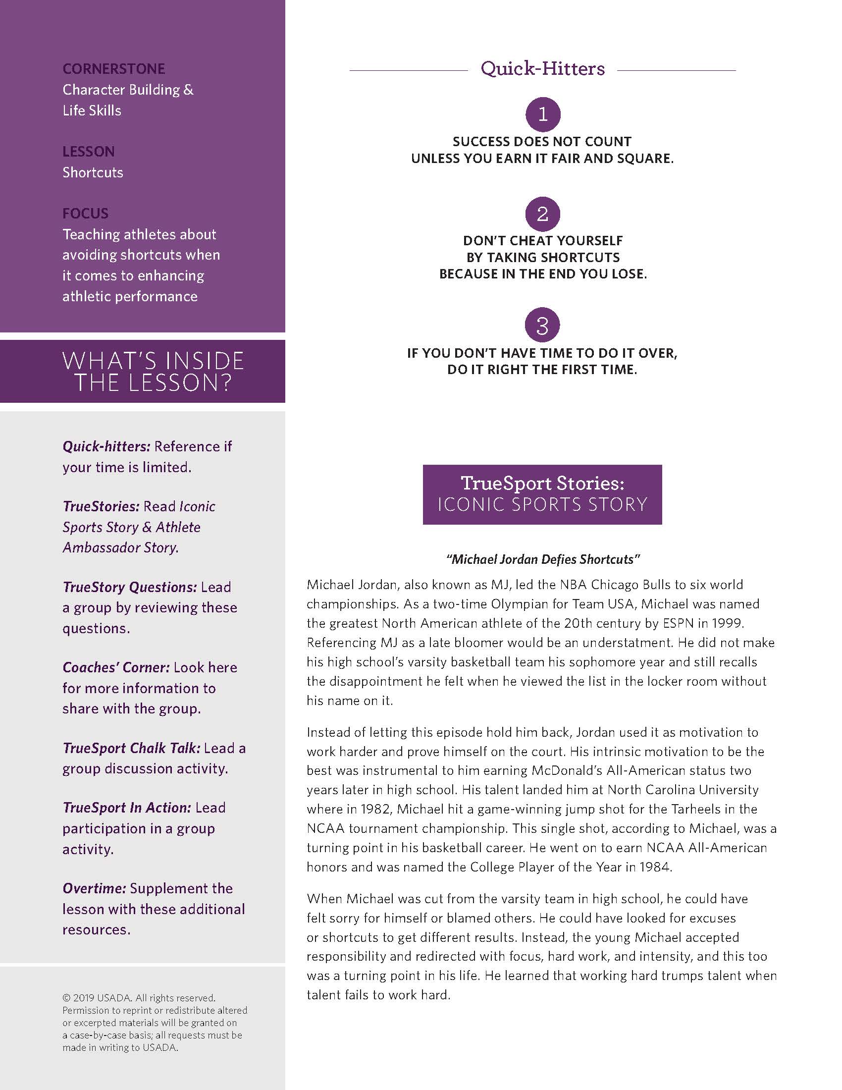 In addition to the Shortcuts Lesson Booklet, you will also receive one-page resources tailored for athletes, parents, and coaches that support the information being presented throughout the TrueSport Lesson. These take-home resources help bring the conversation from the field of play to the dinner table!
